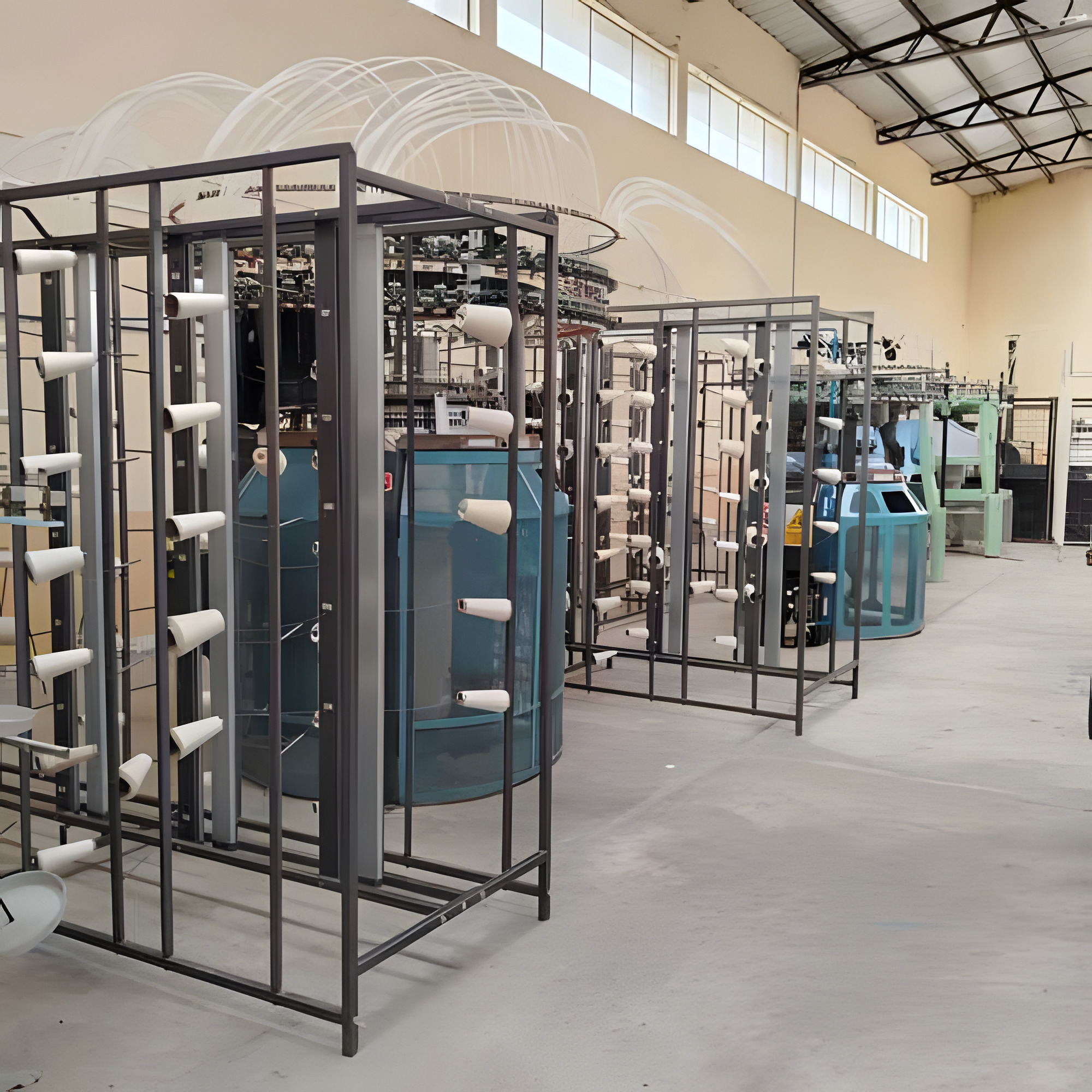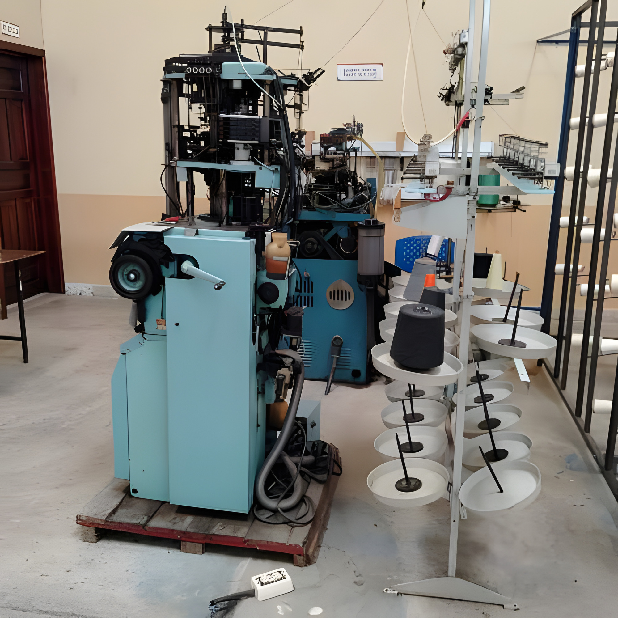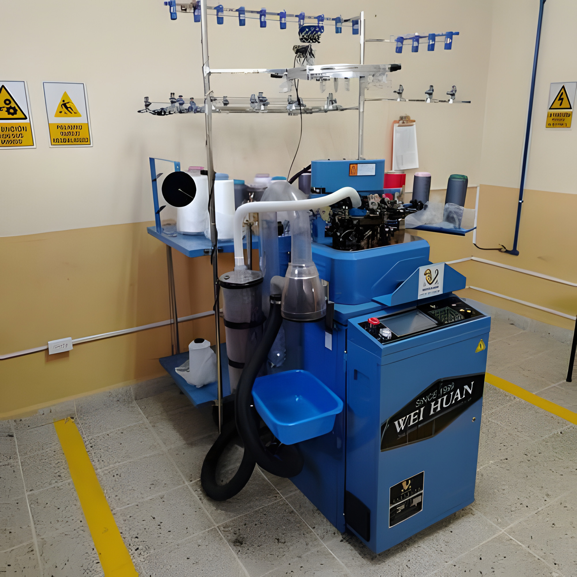 Este laboratorio se divide en dos amplios espacios ubicados en la planta textil del campus de Azaya, de los cuales en uno de ellos se encuentran las máquinas circulares de gran diámetro y en el otro está la máquina calcetera con tecnología electrónica de última generación.